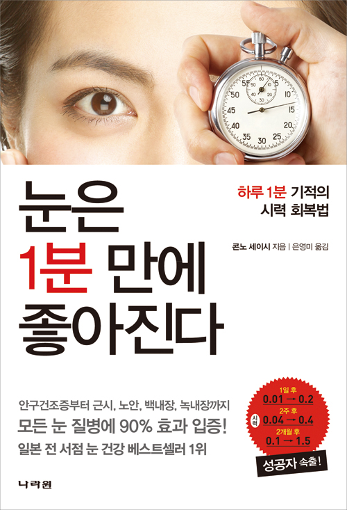 1장. 당신의 눈은 안녕하십니까? ⋅현대인의 눈이 위험하다 ⋅근시는 유전이 아니다 ⋅20~30대에게 증가하고 있는 녹내장 ⋅현대인의 위기 신호, 안구건조증 ⋅노안은 노화 현상이 아니다 ⋅비문증으로 고생하는 여성들 ⋅눈의 구조와 시력의 종류 ⋅노화나 원인 불명은 없다 ⋅무엇보다 혈류 개선이 먼저다 ⋅쉬지 않고 움직이는 우리의 눈 ⋅우리는 왜 눈을 함부로 다루는가 2장. 산소 부족이 눈 건강을 해친다 ⋅눈 건강을 해치는 가장 큰 원인 ⋅모든 질병의 원인은 산소 결핍이다 ⋅산소를 공급하면 집중력이 향상된다 ⋅망막색소 변성증 환자가 보여준 기적 ⋅우리는 뇌로도 보고 있다 ⋅스트레스가 시력을 저하시키는 이유 ⋅우리 몸이 지닌 자연치유력을 믿자 ⋅지나친 약물 의존은 독이다 ⋅질병 관리와 시력 관리는 구분되어야 한다 ⋅나에게 가르침을 얻고자 찾아온 안과의사 ⋅세미나에서 검증된 시력 향상의 기적 제3장. 1분 만에 눈이 좋아지는 7가지 시력 회복법 ⋅7가지 시력 회복 트레이닝 ⋅트레이닝 ① 두드리기 ⋅트레이닝 ② 흔들기 ⋅트레이닝 ③ 문지르기 ⋅트레이닝 ④ 지압법 ⋅트레이닝 ⑤ 호흡법 ⋅트레이닝 ⑥ 확인법(뇌 트레이닝) ⋅트레이닝 ⑦ 명상법(뇌 트레이닝) 제4장. 시력을 회복하는 생활습관과 운동 ⋅콘노식 시력 회복법은 부작용이 없다 ⋅간 기능이 시력을 좌우한다 ⋅심호흡과 점프 운동이 시력을 개선한다 ⋅페트병을 이용한 호흡 단련법 ⋅시력을 향상시키는 점프 운동 ⋅자율신경의 기능을 높여라 ⋅자세가 좋아지면 시력이 회복된다 ⋅위장을 부드럽게 풀어주는 복부 마사지 ⋅눈 근육을 단련하는 눈 운동 ⋅콘택트렌즈는 필요할 때만 착용한다 ⋅눈에 좋은 당근을 사랑하라 ⋅눈 건강을 지켜주는 숙면 ⋅생활습관을 고치는 방법 제5장. 시력이 좋아지면 인생이 바뀐다 ⋅시력이 좋아지면 뇌가 발달한다 ⋅시력이 좋아지면 운동능력이 향상된다 ⋅파일럿 시험에 도전한 환자 ⋅시력이 좋아지면 피부도 좋아진다 ⋅시력이 좋아지면 온몸이 건강해진다 에필로그_ 평생 사용할 눈을 소중히 하자 저자